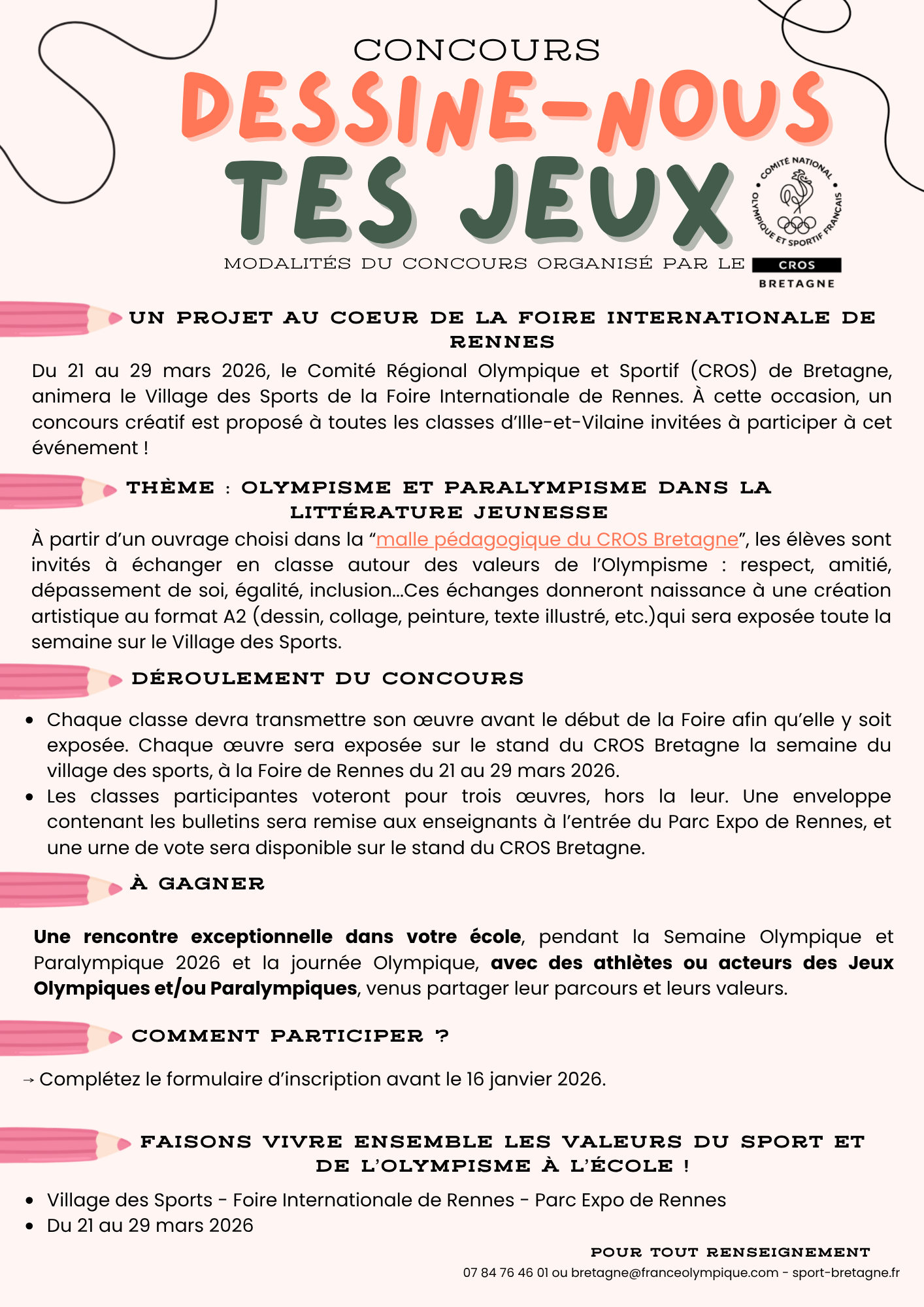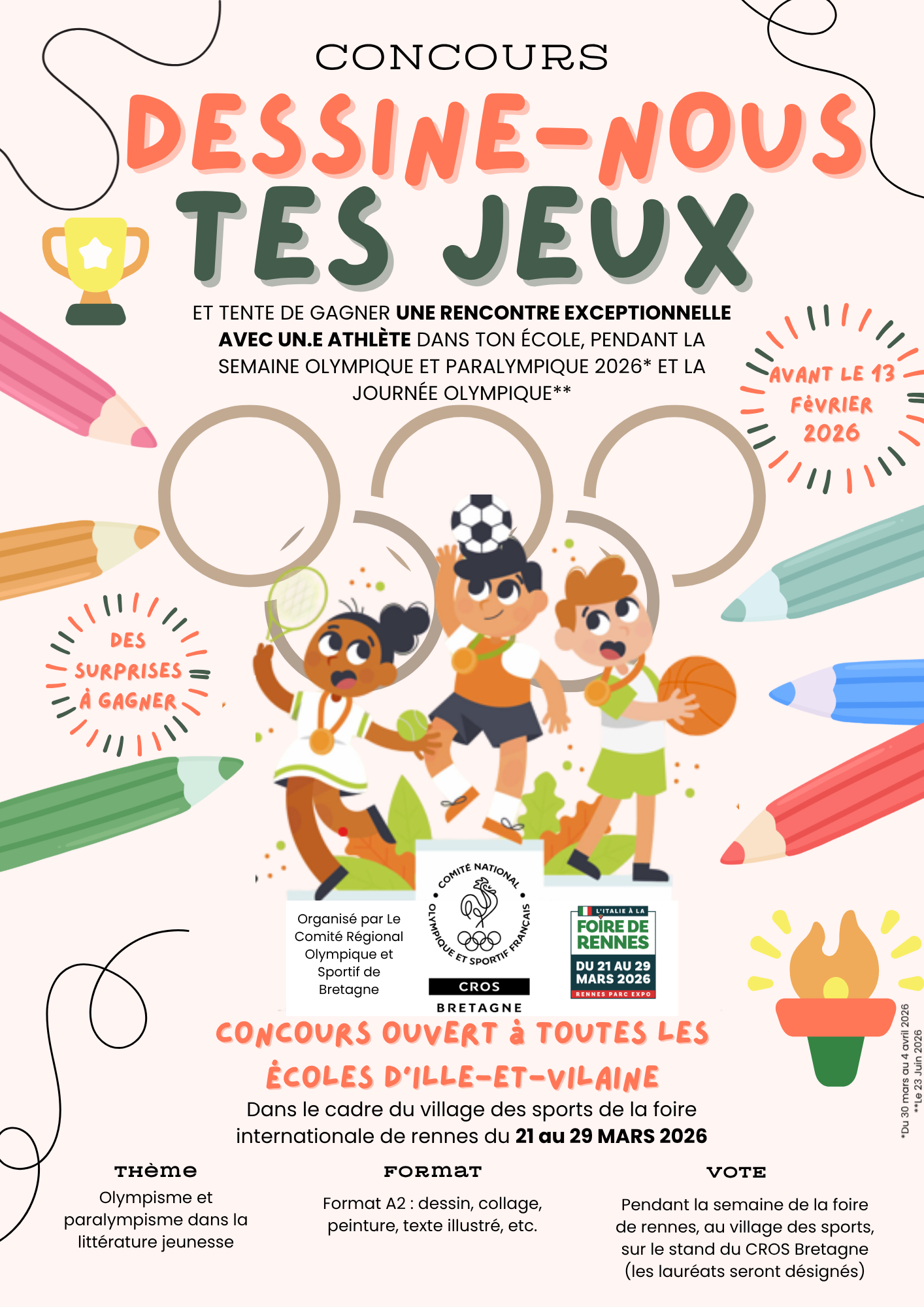 A l’occasion du Village des Sports présent lors de la Foire Internationale de Rennes du 21 au 29 mars 2026, le CROS Bretagne lance son concours créatif Inter-classes pour les classes de maternelle, primaire, collège, sur l’illustration des valeurs de l’olympisme et du paralympisme.